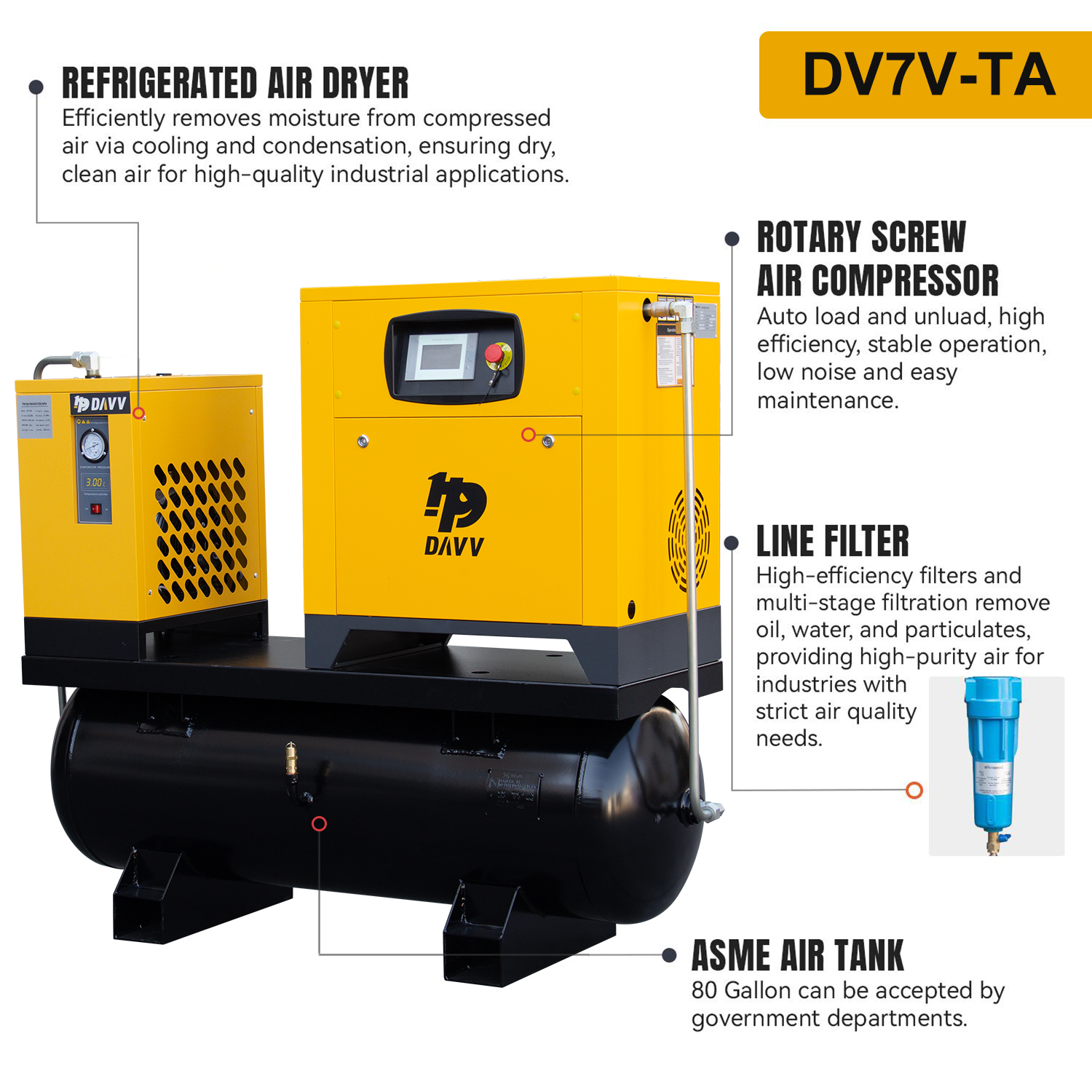 Looking for a complete compressed air solution for your workshop or factory? This 10HP VSD rotary screw compressor with integrated 80-gallon ASME tank and air dryer delivers clean, dry, and stable compressed air for efficient industrial operations.