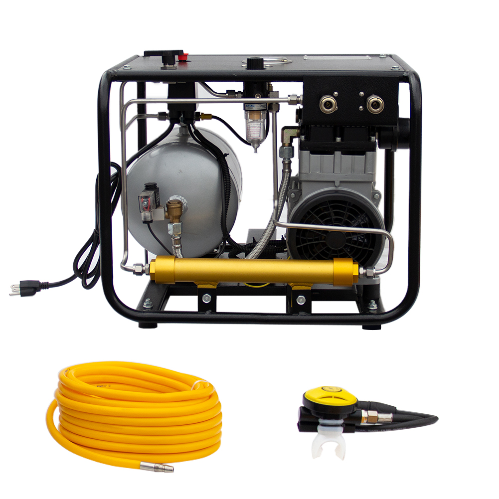 Need a more powerful and stable air supply for shallow diving? This 110V 1100W oil-free piston air compressor is designed for hookah dive systems, delivering reliable and continuous breathing air for underwater work and recreational diving.