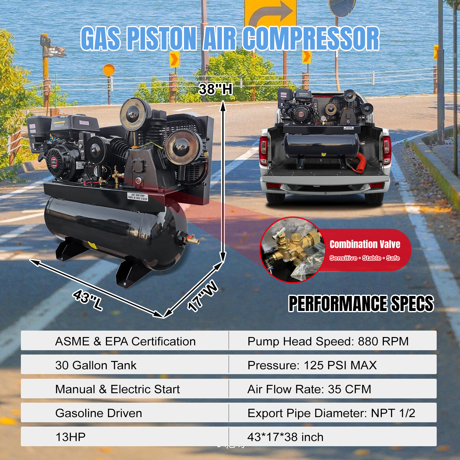 - 30-gallon ASME certified air tank for safety and stability