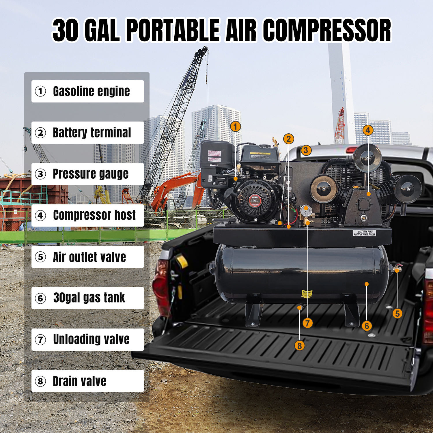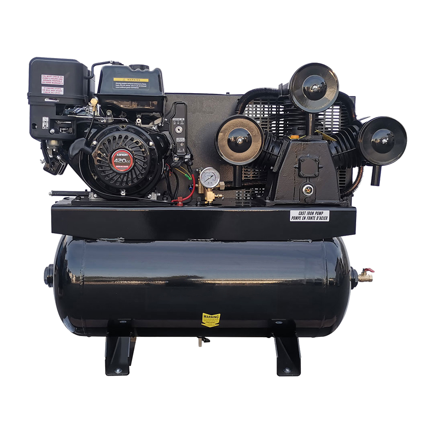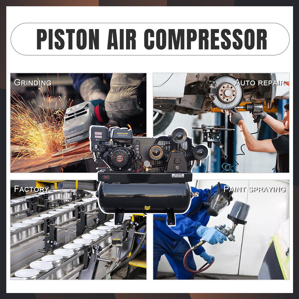 Need a high-performance air compressor for demanding industrial or construction applications? This 13HP gas powered air compressor delivers 44 CFM airflow with a 30-gallon ASME tank, providing powerful and stable air supply for multiple tools and continuous operation.