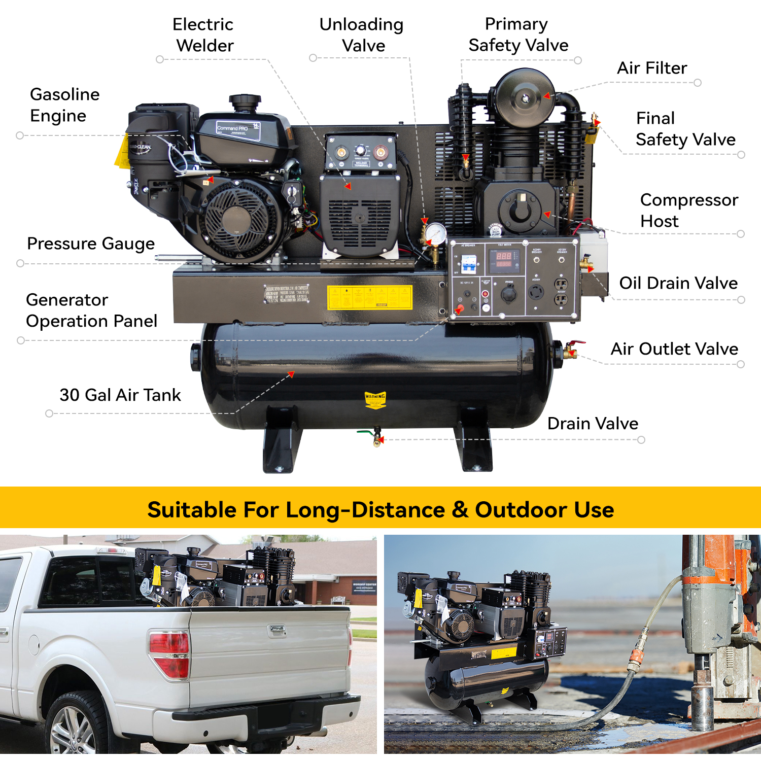 ⚠️ Operate in well-ventilated outdoor areas. Ensure proper maintenance for engine, compressor, and electrical systems.