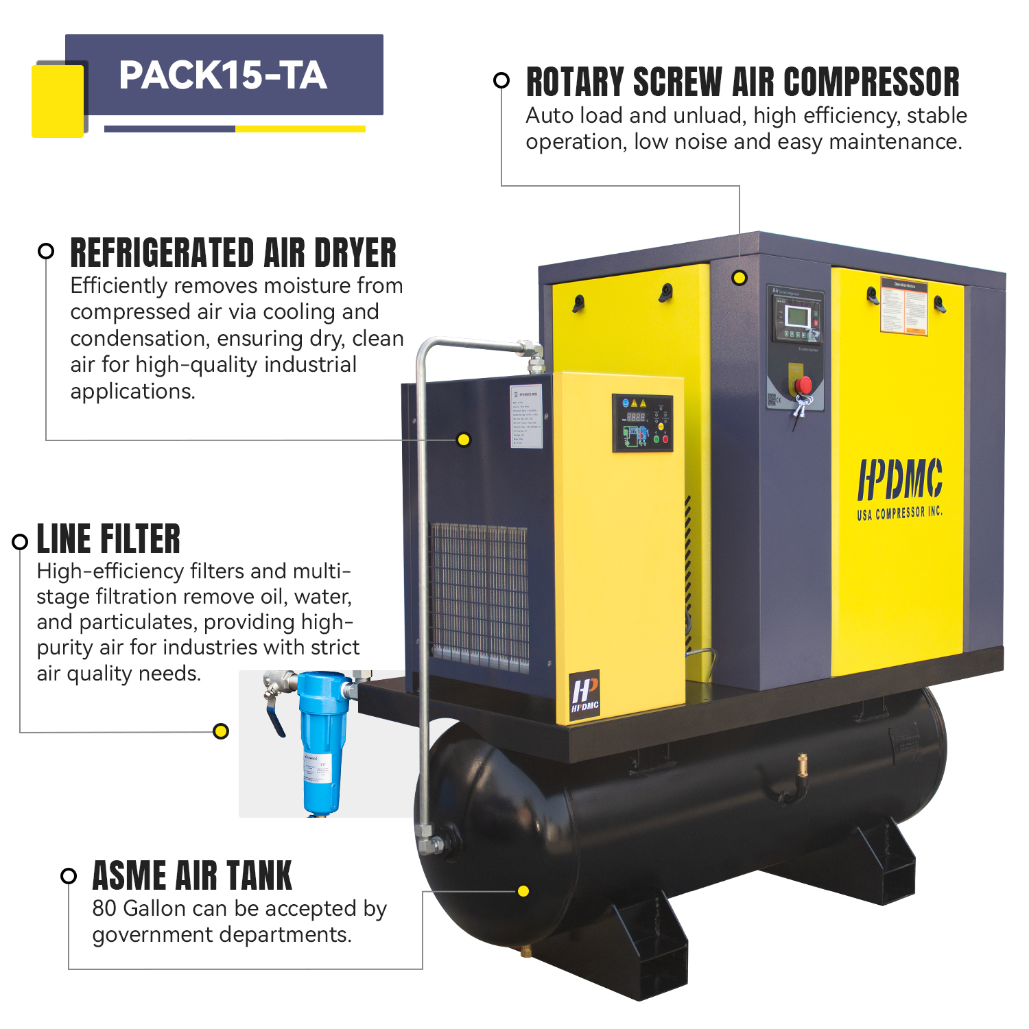 This 20HP all-in-one rotary screw air compressor combines a high-efficiency compressor, an 80-gallon ASME certified air tank, and a refrigerated air dryer into a single compact unit. It ensures clean, dry, and stable compressed air while reducing installation complexity and saving space.