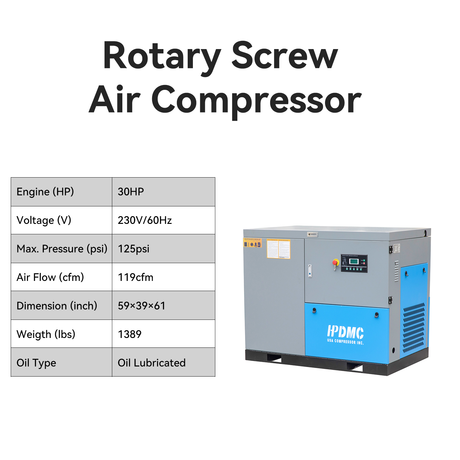 30HP Rotary Screw Air Compressor 120CFM 125PSI 208-230V 3 Phase