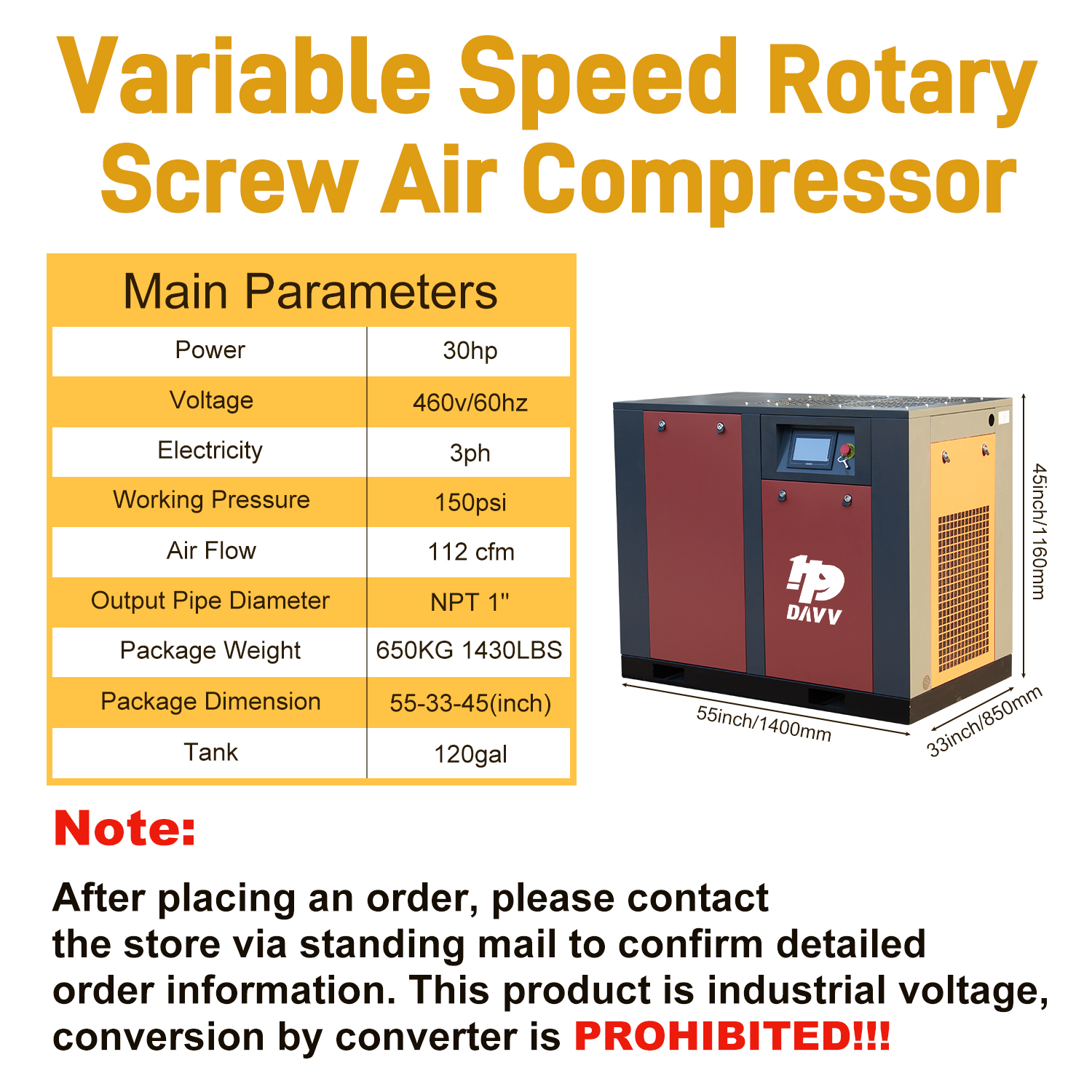 30HP VSD Rotary Screw Air Compressor 112CFM 150PSI 460V 3 Phase