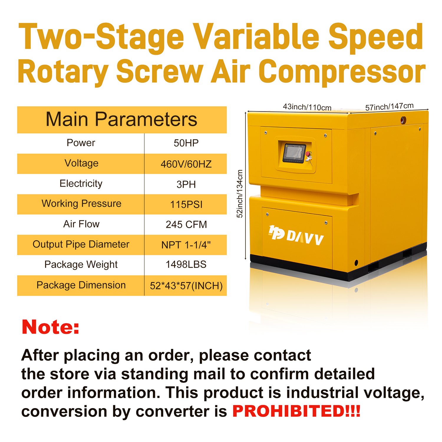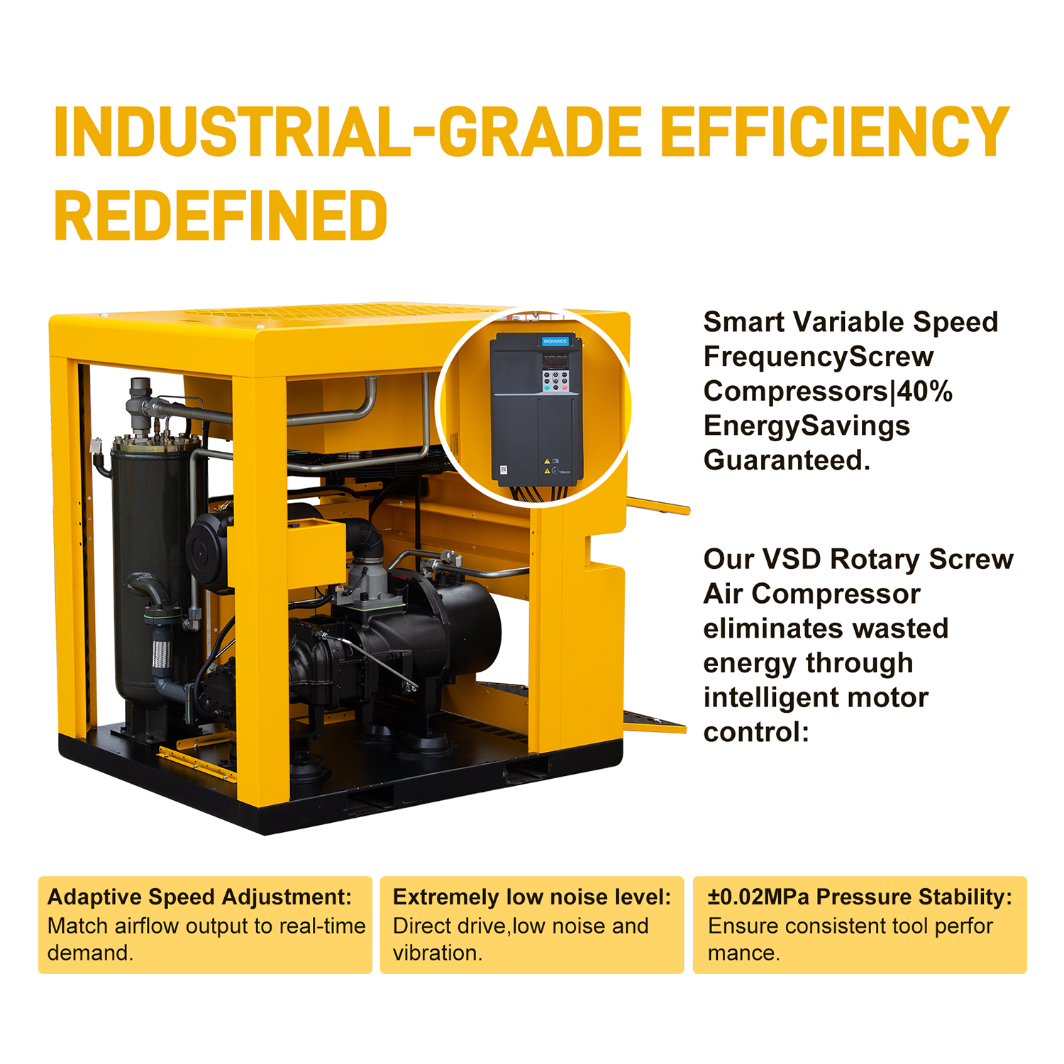 Looking for a high-efficiency industrial air compressor for demanding applications? This 50HP two-stage VSD rotary screw compressor delivers superior airflow, stable pressure, and maximum energy savings for continuous operation.