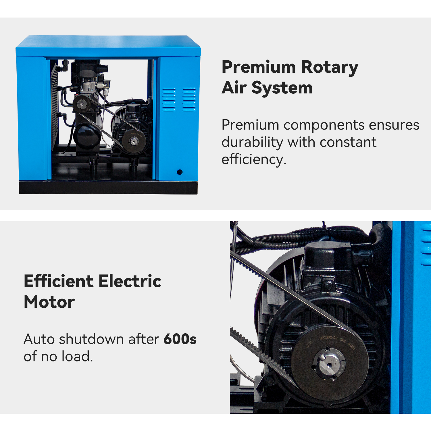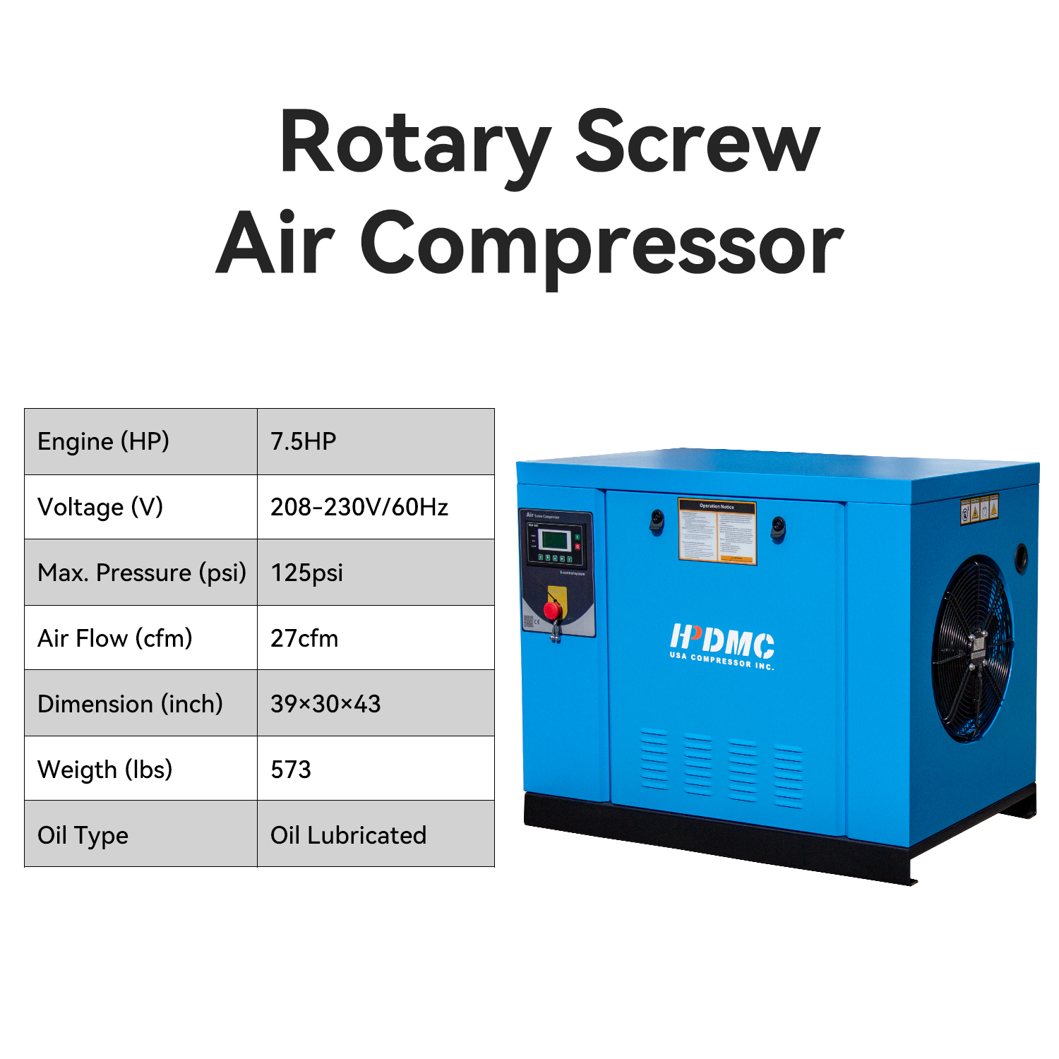 This 7.5HP rotary screw air compressor is designed for reliable and continuous compressed air supply. It provides stable airflow at 27 CFM and maintains consistent pressure at 125 PSI, making it suitable for a wide range of industrial and workshop applications.