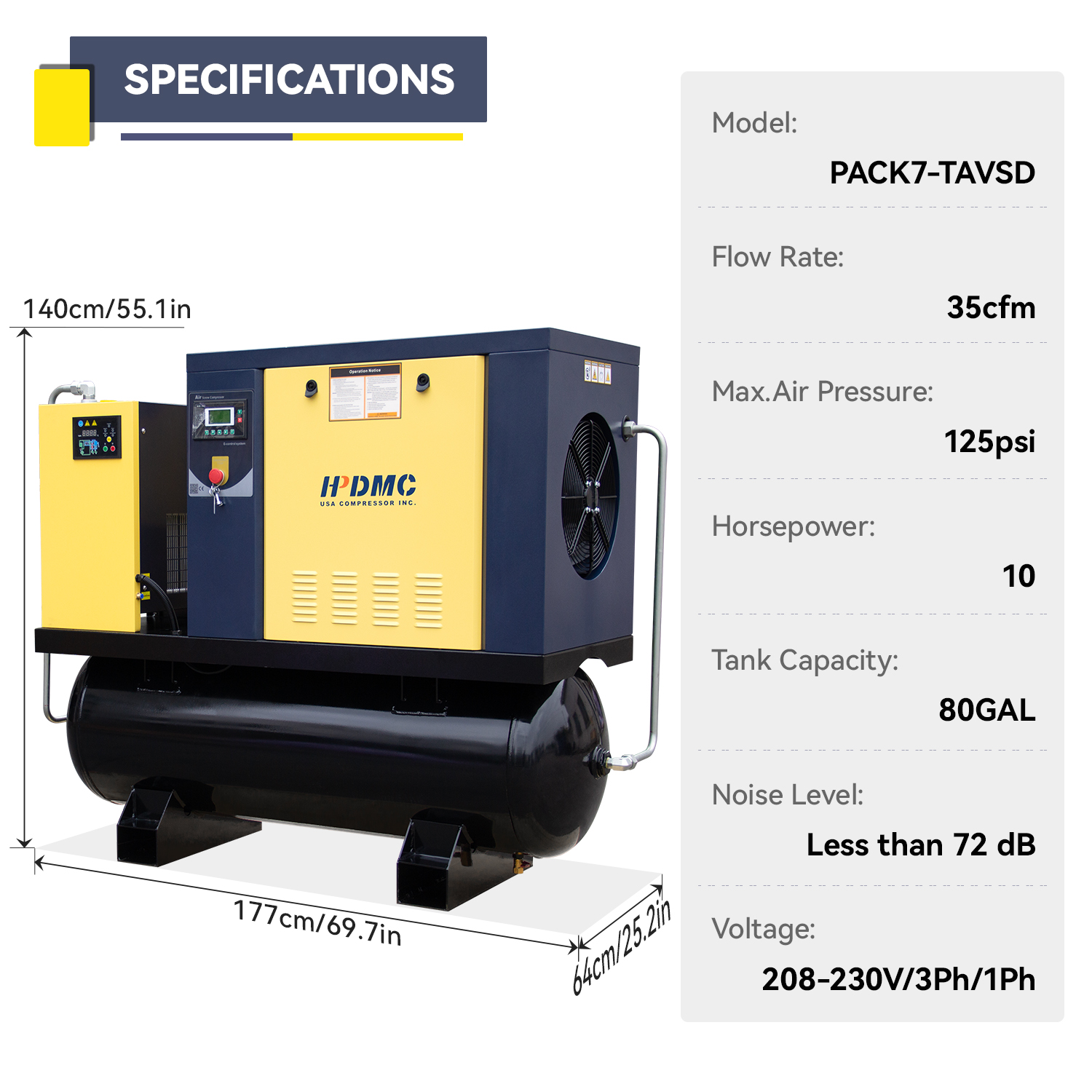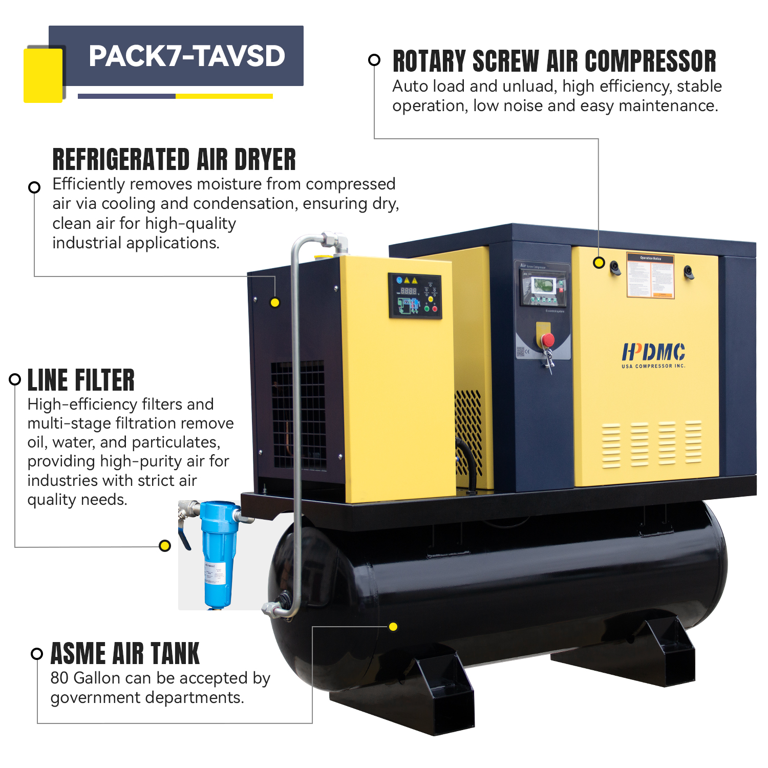 This 10HP VSD rotary screw air compressor integrates an 80-gallon ASME tank and a built-in air dryer, providing a complete compressed air solution. It delivers clean, dry air while reducing installation complexity and improving system efficiency.